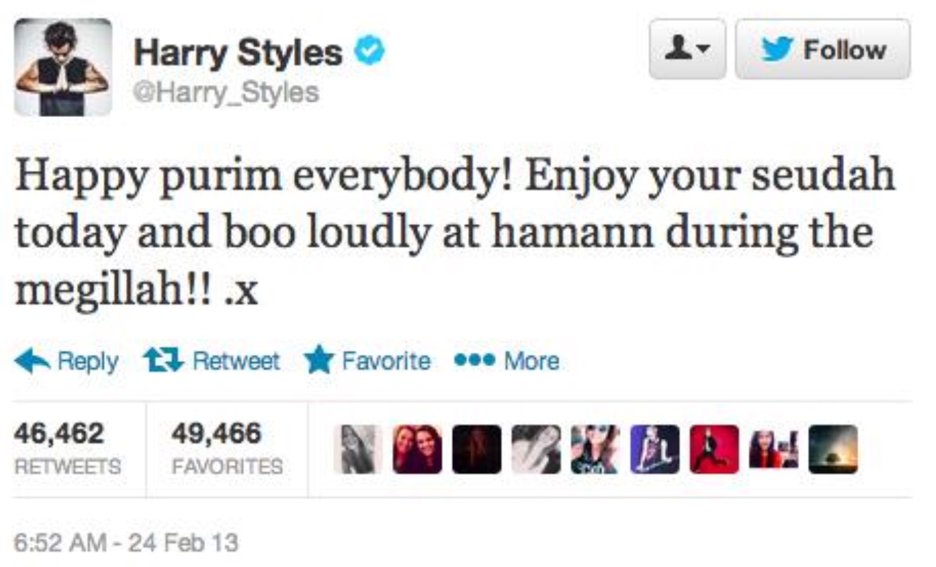 Harry even knows a lot about Purim and was wishing everyone a good one in 2013.