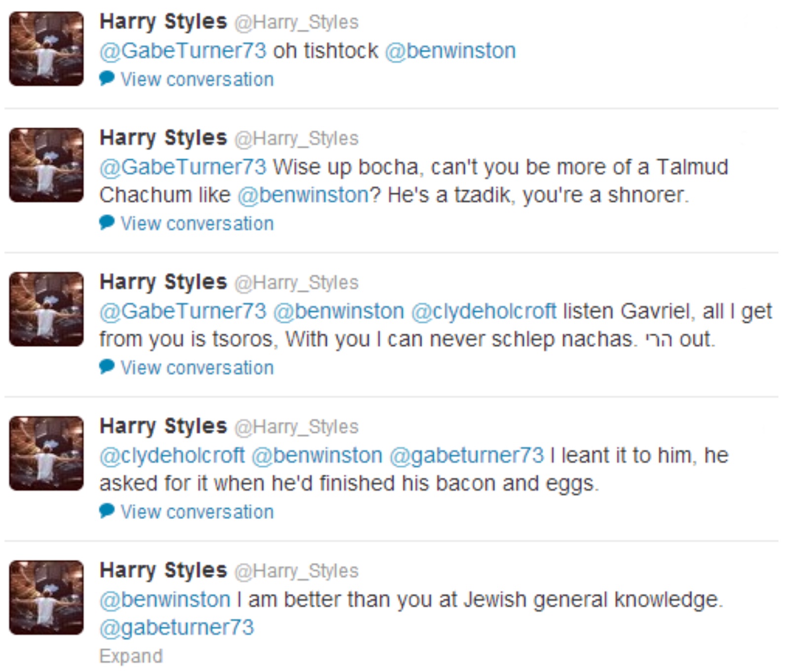 In a Twitter exchange with Gabe Turner and Ben Winston, Harry replied in a bit of mixed English and Yiddish. Jewish grandmothers everywhere would be proud!