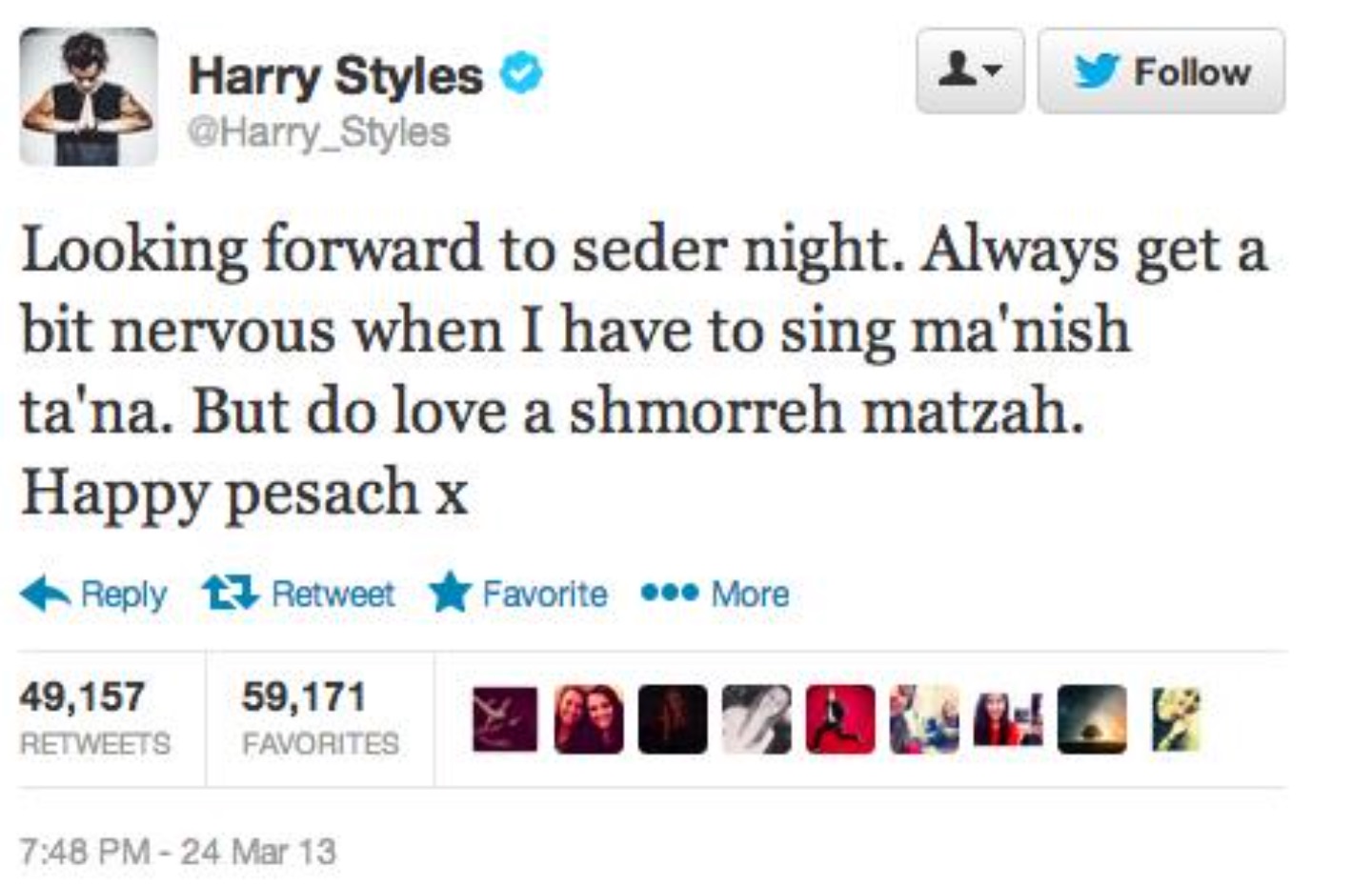Harry pulled out all the stops with his 2013 Passover tweet. Maybe this year he’ll post a video of him singing the Four Questions!